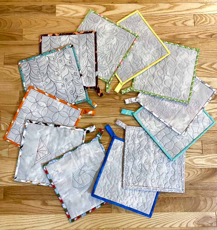 10 key tools for successful free motion quilting and how to use them by Robin Bogaert December 6, 2021 written by Robin Bogaert December 6, 2021 649 This week I’m excited to change the mindset of anyone who’s intimidated by free motion quilting, or a beginner who just wants to learn how to free motion quilt effectively. As a seasoned free motion quilting instructor, I promise you that learning to free motion quilt is not only achievable, it’s a very important skill to learn and make all your quilting projects look gorgeous. We’ll discuss essential tricks, supplies, and tools you need to get started and conquer your fears. I’ll also share a repertoire of quilting designs to practice and choose from. We’ll also discuss the right fabric choices with Fabric Creations and Fabric Palette, Gütermann threads, UNIQUE Quilting Therm Fleece, Sew Easy Jelly Monster Template, Sew Easy Freezer Paper, Odif 505 Temporary Adhesive for Fabric, SCHMETZ Quilting Needles and the UNIQUE Sewing Wash-Out Marker. These essential quilting supplies are guaranteed to improve the look and quality of your free motion quilting. To not waste fabric, I suggest we make some seasonal potholders from our practice samples this week as you follow along. I always tell my students to make potholders, mug rugs or coasters from their practice samples. See my practice potholders below. Free motion quilted sandwiches ready to be made into practical potholders 12 seasonal potholders made from practice samples with beautiful Fabric Creations and Fabric Palette fabric Let’s get started with essential supplies and tools you need to achieve success with free motion quilting. Supplies needed to practice free motion quilting These are the items you need for free-motion seasonal potholder practice samples. materials free motion foot for your machine (also called a stipple foot, darning foot, spring action foot and embroidery foot); you must be able to lower your feed dogs (please refer to a machine manual for this) 3 yds of background fabric in gray, white or a light neutral color (so that stitches are visible) for front and back of samples 2 yds of heat resistant or thermal batting 12 different pieces of seasonal fabric made of 100% cotton (these can be fat quarters or ¼ yard pieces) thread (I used 100% cotton, metallic variegated, 100% polyester and Gütermann Sew-All thread) templates or shapes to pre-draw quilting guidelines freezer paper (optional, but helpful to pre-draw designs) temporary adhesive spray for the fabric and batting quilting Needles (I used 75/11, and 90/14 for metallic threads) wash-out marker for pre-drawing designs on fabric paper and pen or pencil to draw designs before stitching (essential) ruler Velcro (hook and loop) for the back of the recipe pocket (optional) recipe card with favorite recipe written on it to put in the pocket (12 copies optional) candy of choice (chocolate preferred!!!) to put in the pocket (optional) Once you gather all supplies, it’s time to cut some fabric practice samples, thermal batting, binding, pocket, and loop tab fabric for the potholders. Note: I sewed pockets on the back of the potholders so that if I give away my samples as gifts, I can place a recipe card or some candy in the pocket. This is of course an optional step. This Fabric Creations and Fabric Palette fabric was used for this week’s practice sample potholders. Cutting instructions Cut 24 pieces of white, gray, or neutral light fabric 12” x 12”; 12 pieces for the front (practice area) and 12 for the back. Cut 12 pieces of heat resistant batting 12” x 12”. Cut 12 – 2½” x 44” pieces of binding fabric from the seasonal fabric (you need to piece this from your fat quarter (FQ) or ¼ yard pieces. Refer to free binding tutorial download here). Cut 12 pieces of fabric 10” x 10” seasonal fabric for the pocket on the back. Cut 12 pieces of Velcro 1” x 1” (loop and hook pieces). Cut 12 pieces of fabric 2” x 6” for loop tab. Note: Cutting instructions are for 12 practice samples. Gorgeous Fabric Creations and Fabric Palette cotton along with UNIQUE Quilting Therm Fleece and Velcro cut out and ready for practice samples Tomorrow we’ll be working with Fabric Creations Cotton, UNIQUE Quilting Therm Fleece, Gütermann Thread, Odif 505 Temporary Spray Adhesive, and SCHMETZ Quilting Needles. Join me as I share tips for success and 3 beginner free motion designs to draw and quilt. These tips and designs will ensure that you start your free motion pathway to success. This is part 1 of 5 in this series Go to part 2: 22+ essential TIPS for free motion quilting success [beginners] Print this page or save as a PDF 0qs393Fabric CreationsFabric Palettefabricsfree motion tutorialfree patternsGütermann Sew-All ThreadnotionsOdif 505 Temporary Quilt Basting Adhesive Fabric SpraypotholdersSCHMETZ Quilting Needlessew easySew Easy 9 Piece Circle TemplateSew Easy Freezer PaperSew Easy Jelly Monster TemplatetutorialsuniqueUNIQUE Quilting Therm FleeceUNIQUE Sewing Wash-Out Marker FacebookTwitterPinterestLinkedinRedditWhatsappTelegramEmail Robin Bogaert Robin Bogaert is a long arm quilter, creator and blogger at quiltingintheloft.com and has many years of quilting experience. Robin was the past owner of a quilt shop in Windsor, Ontario and now resides in Waterloo. Robin's roots in quilting are traditional, however she appreciates modern quilt design as well and considers the focus of work to be designing, teaching, trunk shows, free motion quilting, ruler work and thread painting. In addition to her passion for sharing all things quilting, Robin is busy with pattern design and sells her patterns on her website and with Craftsy.com. Robin was featured in the Summer 2016 and 2017 (Canada 150th) edition of Quilters’ Connection Magazine and is a new guest contributor at QUILTsocial.com. previous post Spectrum QAL Block 8 with Pam Voth: Delightful Collection by Riley Blake next post 22+ essential TIPS for free 