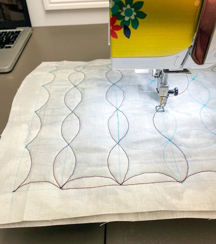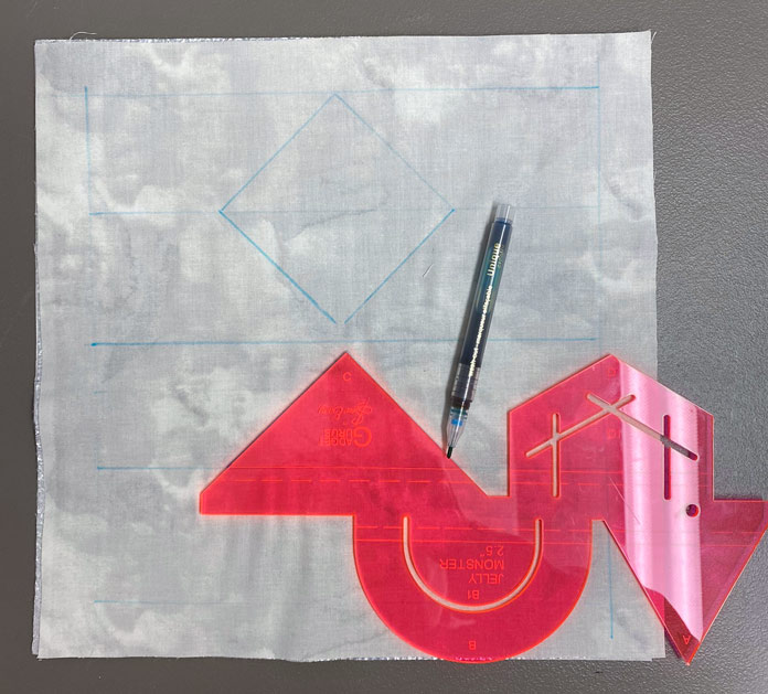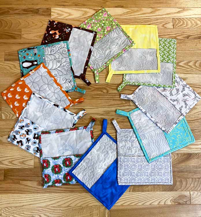 2 great template sets you need for impressive free motion quilting by Robin Bogaert December 10, 2021 written by Robin Bogaert December 10, 2021 811 All week I’ve discussed free motion designs that quilters need to draw out, and yesterday, we learned how to plan out and free motion quilt 3 nature-inspired designs. The good news with today’s post, is we can use templates and freezer paper to assist with the drawing process using the Sew Easy Jelly Monster Template and the Sew Easy 9pc Circle Template Set, along with Sew Easy Freezer Paper. These tools will make your sewing quilting projects so much easier. The Sew Easy 9pc Circle Template Set In the Sew Easy 9pc Circle Template Set, templates range in size from 1” to 5”. I’ll start with the circle templates. I used the 2½” circle from the 9 templates (a great value) to design the ‘Orange Peel’ quilting pattern. I drew a 2” grid within a 10” square as shown. I then made sure the edge of the template met the intersections of the grid and used the template to mark my orange peel sections. These templates are great because they’re made in such a bright color that is easy to see, they’re see-through and have vertical, horizontal, and 45-degree lines marked on them making them great for centering. The number of sizes available also makes them great for applique. Using the 2½” circle template to make an orange peel design for free motion quilting Quilting the orange peel design using a serpentine direction to make the design continuous The finished orange peel design completed with Gütermann Sew-all Thread in Burgundy These circle templates ranging in size from 1” to 5” are also useful for drawing out appliques and background quilting designs…the possibilities are endless. Another idea for using the Sew Easy 9 piece Circle Template Set – Applique and Quilting Designs The Sew Easy Jelly Monster Template is useful to draw out shapes and cut from strips of fabric folded in half, or 2½” jelly roll strips sewn together. Again it’s made in the pink clear durable acrylic with clear markings for 2 sizes of circles, 2 sizes of hexagons, a diamond, a square and 2 sizes of triangles. See the package instructions below. Jelly Monster Template – a very useful template to draw shapes for free motion quilting as well as for cutting fabric applications Back of package and instructions for the Jelly Monster Template – great for cutting jelly rolls and for use as a drawing tool for free motion quilting I used the Jelly Monster Template today to draw triangle, square and hexagon shapes. A template like this has so many uses and limitless possibilities. I drew out a square with it, as shown. Drawing the top of the square with the Jelly Monster Template Drawing the bottom of the square with the Jelly Monster Template Designing a feather shape within a square Designing a feather shape within a square Designing a feather shape within a square – top is complete Designing a feather shape within a square – bottom is complete Square shape is quilted with Gütermann Metallic Thread Drawing a triangle shape with the Sew Easy Jelly Monster Template Place ½” and 1” marks with a UNIQUE Sewing Blue Wash-out Marker to use as guidelines for quilting Sew Easy Jelly Monster Template, SCHMETZ Quilting Needles, Gütermann Thread and UNIQUE Sewing Wash-out marker make great free motion quilting possible Ready for an extreme challenge? Try drawing a hexagon shape with the Jelly Monster Template to create a paradox design by marking ¼” all around the hexagon with a UNIQUE Sewing Wash-out Marker, as shown. Then sew from ¼” mark to ¼” mark with a controlled, slow and straight free motion quilting line, as shown. Drawing out a hexagon with the Jelly Monster Template Adding ¼” increments to sew a line from ¼” to ¼” on the hexagon Quilting the paradiox design The Paradox, Challenge Design quilted with Gütermann Sew-all Thread in Teal Sew Easy Freezer Paper, great for appliques and marking for free motion quilting Freezer paper can assist with all kinds of quilting projects including applique, for tracing designs and shapes. I use it frequently to draw out a quilting design on the matte side ahead of time, and place it directly on a quilt. I then iron it to the quilt (wax side) to the fabric for temporary adhesion, and then sew right on top of the design. It eliminates the step of transferring the design to fabric, saving time. These steps are shown below. Design marked onto freezer paper and ironed to the right side of fabric Design quilted onto the freezer paper Peeling off the freezer paper Freezer paper design completed How to make potholders from free motion quilting practice samples Square your practice sample down to 10” x 10”. Fold the pre-cut 10” x 10” fabric in half, wrong sides together. Place a piece of Velcro hook towards the folded side centered by measuring 4½” up from the raw left side and bottom, as shown. Pin the Velcro in place and sew. Measuring the pocket for the Velcro 4. Measure up the same way on the backside of the quilted sample, and place the loop of the Velcro. Pin and sew, as shown. Measuring the Velcro for the quilt practice sample 5. Matching Velcro and raw edges, sew the pocket piece to the back of the quilted practice sample with a ⅛” seam allowance along the sides and bottom. Lining up the Velcro and raw edges ready for basting 6. Bind as desired. For help with binding, check out this free quilt binding tutorial. 7. To add a hanging tab, cut a 2” x 6” piece of corresponding fabric and fold it in half lengthwise wrong sides together. Sew along the length, turn it to the right side, then press and sew it to the left corner backside of the potholder. Loop tab added to the back of the potholder 8. Add a recipe or candy to the back pocket (optional). Adding a recipe and candy to the potholder pocket Front of potholders Back of potholder shows off the seasonally beautiful F