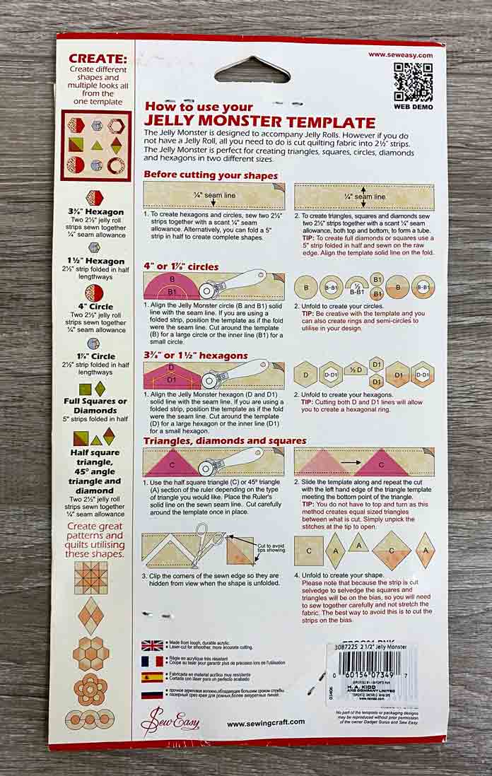 The Sew Easy Jelly Monster Template is useful to draw out shapes and cut from strips of fabric folded in half, or 2½” jelly roll strips sewn together. Again it’s made in the pink clear durable acrylic with clear markings for 2 sizes of circles, 2 sizes of hexagons, a diamond, a square and 2 sizes of triangles. See the package instructions below.