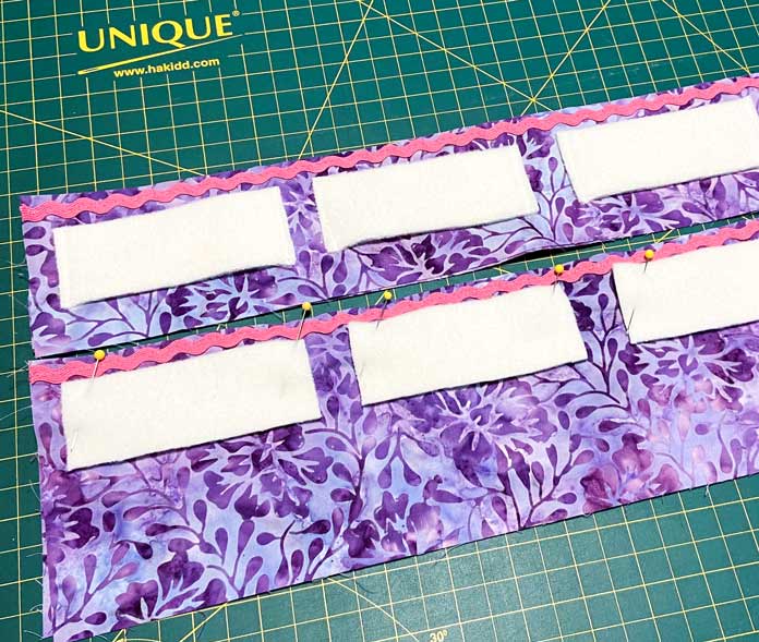 I want to use some UNIQUE Medium Hot Pink Rick Rack to embellish and strengthen the top of the pocket. I cut a piece 20″ long and placed it on the pocket along the folded edge. About ½” should hang over each end of the pocket. I then used a straight stitch on my NQ900 to sew the rick rack onto the fabric.