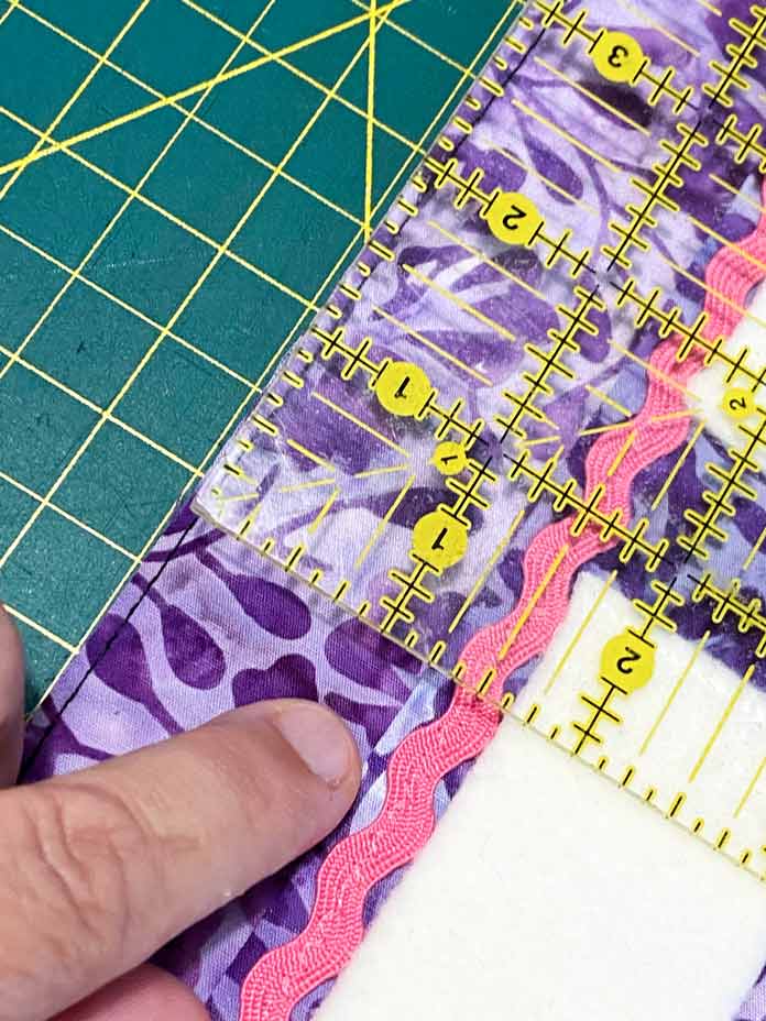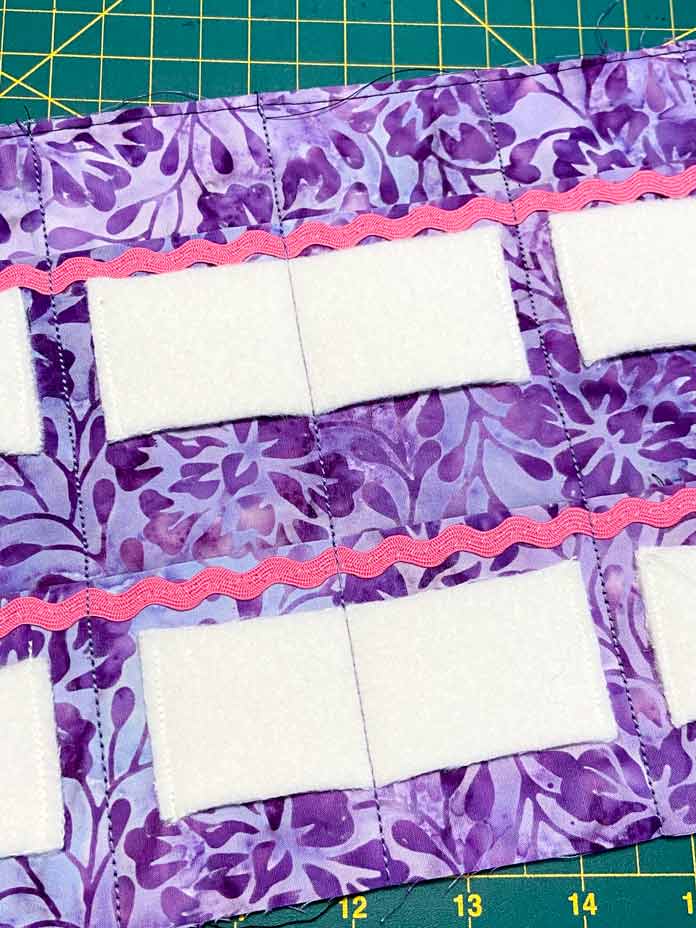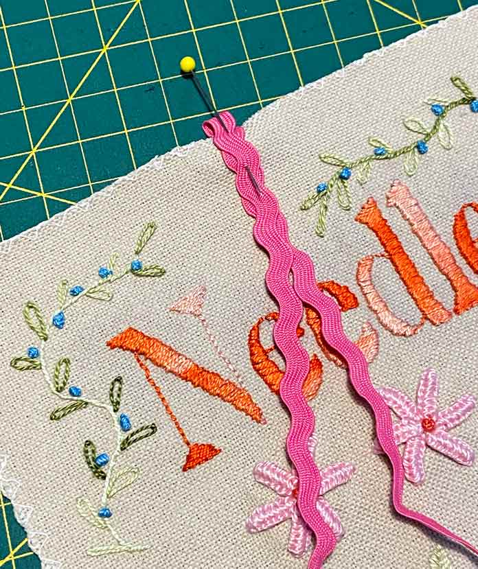 Fold the rick rack in half and pin it to the center of the embroidered panel at the end that says Needles. Make sure the ends of the rick rack are laying along the panel and not the other direction.