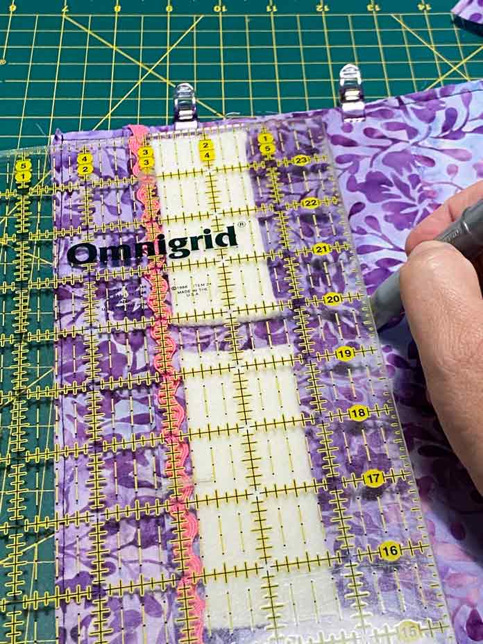 Measure 4½” from the top of the interfaced layer and mark a sewing line all the way along the pocket. This will make the pockets 3″ deep (the same as the smaller pocket).