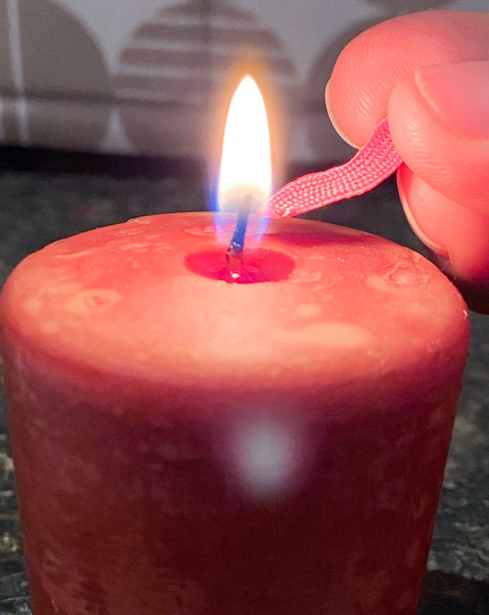 First, cut a piece of the UNIQUE Medium Hot Pink Rick Rack about 30″ long. Since this product is 100% polyester, you can melt the ends with a candle to prevent them from unravelling. I find that passing the end of the ribbon or rick rack just through the bottom of the flame works best. If you pass it through at the tip of the flame it may leave the rick-rack black and sooty.