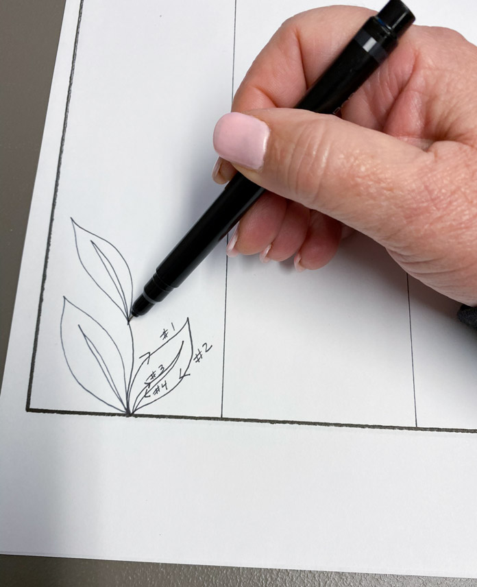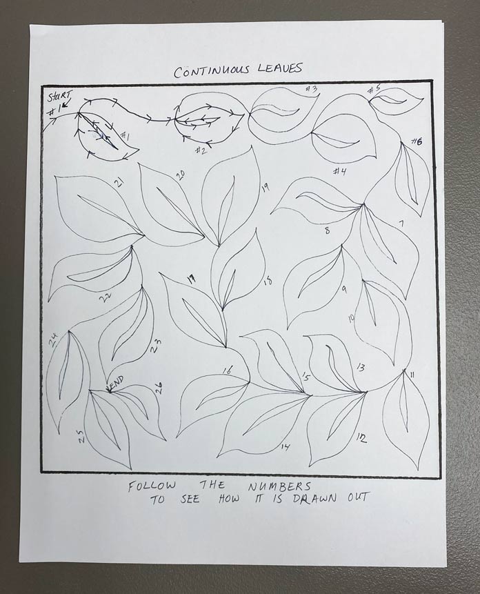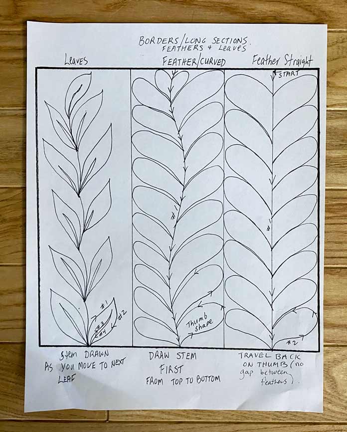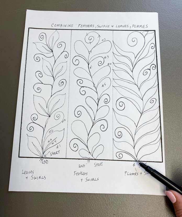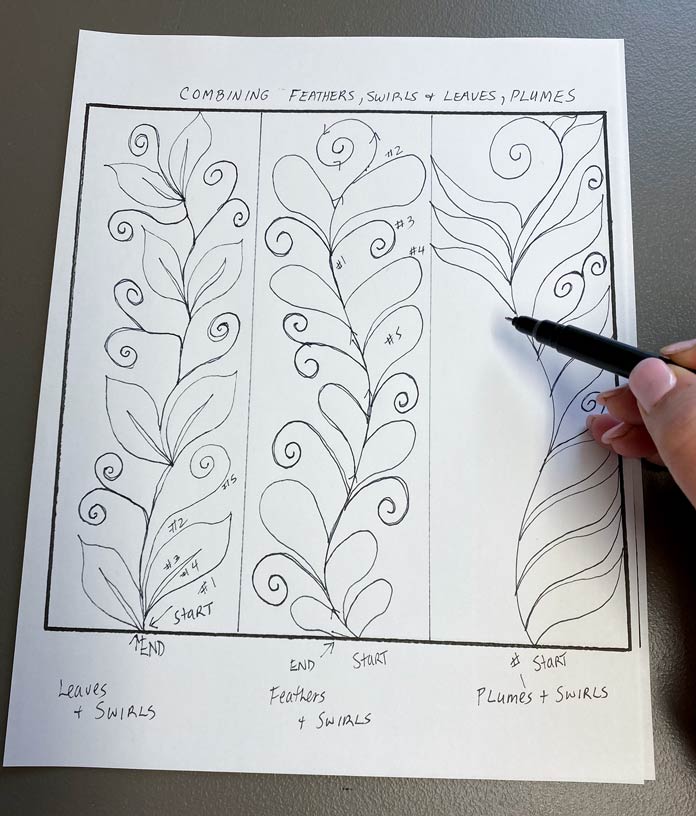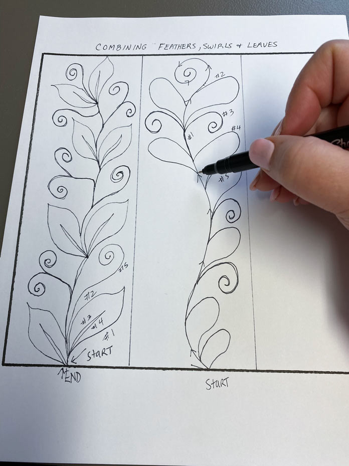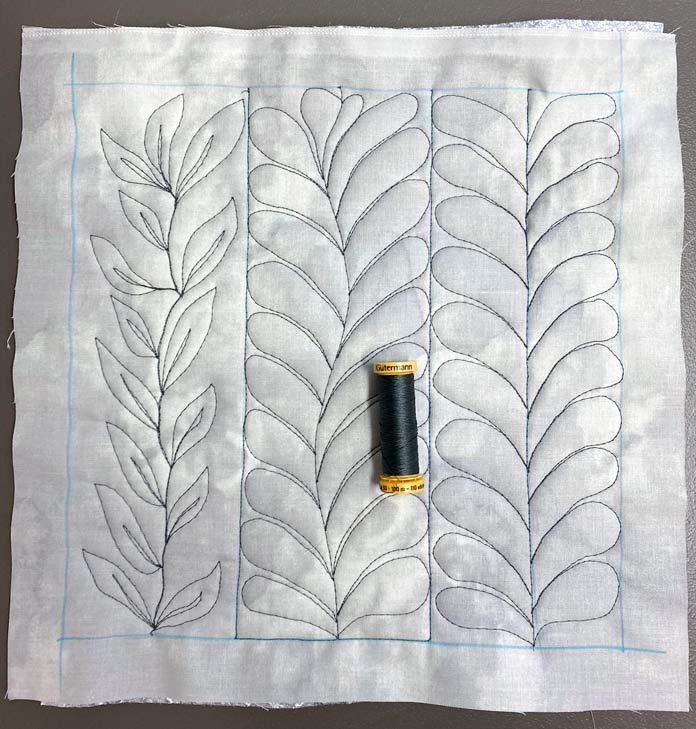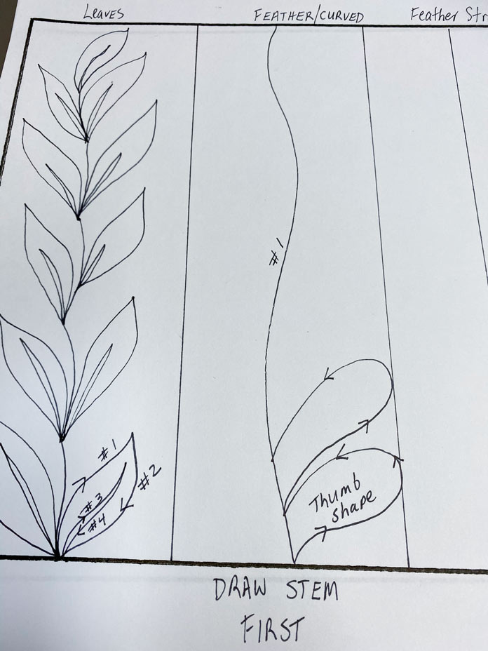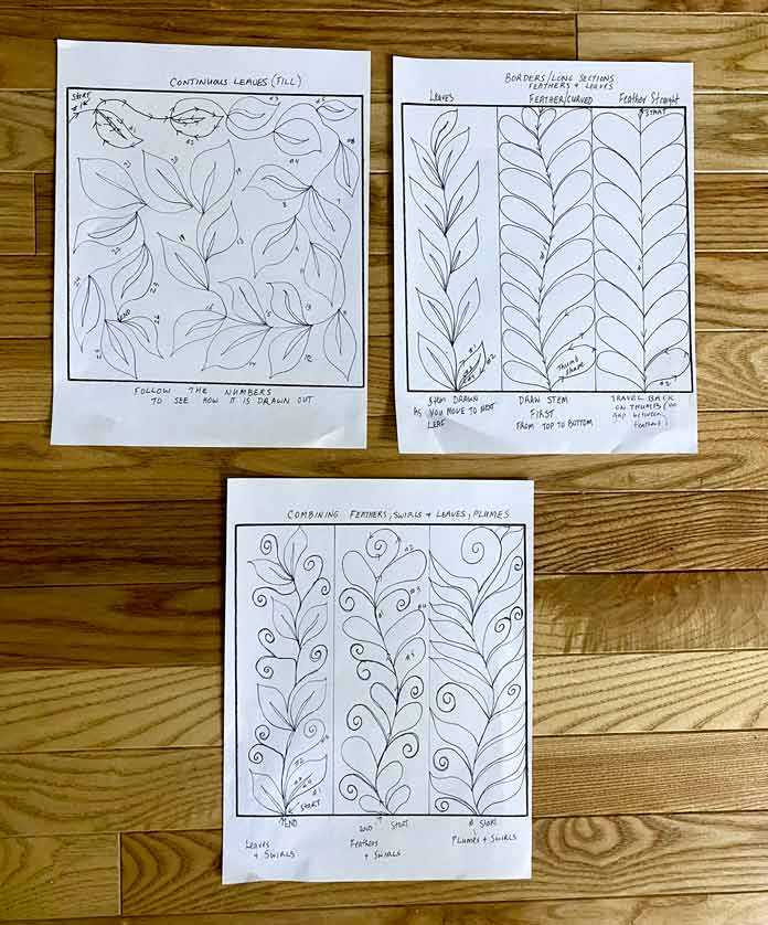 Boost your free motion quilting skills with these 3 nature-inspired designs by Robin Bogaert December 9, 2021 written by Robin Bogaert December 9, 2021 669 This week, I started out with simple fill stitches and tips for success with Free Motion Quilting (FMQ). Yesterday, we looked at 3 different spiral designs. Today, I want to discuss organic looking leaves, feathers, and plumes to add some very beautiful texture to quilts. I continue to work with Gütermann Sew-All Threads, Metallic Threads and Cotton Threads as well as Fabric Creations – Grey Textured fabric, and of course the very versatile UNIQUE Sewing Wash-out Marker. I can’t emphasize enough how important it is to draw the designs ahead of time and practice the brain to get ready for FMQ. Below are the drawings I’ll be discussing today: FMQ continuous leaves, leaf borders, feathers and combining feathers, swirls, leaves and plumes. Pre-drawing leaves, leaf borders, feathers, combining leaves, feathers, plumes and swirl designs to get ready for FMQ Design 1 Continuous leaves The continuous leaf design is drawn out as shown below. How to draw the continuous leaf design before quilting it Full continuous leaf design; follow the numbers to see how the leaves are drawn out Continuous leaf practice sample with Gütermann Cotton Thread in green, an organic design that looks great in green thread! Design 2 Borders The leaf borders and feathers are drawn out as shown below. Leaf border designs and feather designs How to draw the leaf border design As you can see, the stem is drawn continuously as you move to the next leaf. Follow the numbers to design the leaf. Continuing to draw the leaf border design With the feather borders, draw the vein through the middle, first starting at the top moving downwards. When you reach the bottom, draw the first thumb almost like half a heart, and then move your way up the center vein. Drawing a feather border design The right side is complete Draw the other side of the feather continuously from the top down as shown. Feather design completed The straight feather is done in the exact same manner except using a straight center vein, and I tried to omit the gaps between the feathers (a personal choice). Finished leaf and feather FMQ design with black Gütermann thread Design 3 Combining leaves, feathers, plumes and swirls Swirls are really just an elongated leaf without veins. Below is the drawing practice. Drawing practice for leaf, feathers and plumes This design is pretty self-explanatory if you’ve practiced the feathers. As shown, the plumes are elongated leaves in shape, and then swirls are added in between randomly. How to draw feathers and spirals Finishing the design Feathers, leaves, plumes combined with swirls and stitched with black Gütermann thread Completed designs as potholders Join me tomorrow for a discussion about some exciting Sew Easy Monster and Circle templates. I’ll discuss how templates and Sew Easy Freezer Paper can help with quilt marking and the design process. I’ll also share my process for making these quilt practice samples into easy, practical potholders, ready for gift giving. This is part 4 of 5 in this series Go back to part 3: How to free motion spirals on your quilt: 3 dynamic designs Go to part 5: 2 great template sets you need for impressive free motion quilting Print this page or save as a PDF 0qs393Fabric CreationsFabric Palettefabricsfree motion quilting tutorialfree patternsGütermann Sew-All ThreadnotionsOdif 505 Temporary Quilt Basting Adhesive Fabric SpraypotholdersSCHMETZ Quilting Needlessew easySew Easy 9 Piece Circle TemplateSew Easy Freezer PaperSew Easy Jelly Monster TemplatetutorialsuniqueUNIQUE Quilting Therm FleeceUNIQUE Sewing Wash-Out Marker FacebookTwitterPinterestLinkedinRedditWhatsappTelegramEmail Robin Bogaert Robin Bogaert is a long arm quilter, creator and blogger at quiltingintheloft.com and has many years of quilting experience. Robin was the past owner of a quilt shop in Windsor, Ontario and now resides in Waterloo. Robin's roots in quilting are traditional, however she appreciates modern quilt design as well and considers the focus of work to be designing, teaching, trunk shows, free motion quilting, ruler work and thread painting. In addition to her passion for sharing all things quilting, Robin is busy with pattern design and sells her patterns on her website and with Craftsy.com. Robin was featured in the Summer 2016 and 2017 (Canada 150th) edition of Quilters’ Connection Magazine and is a new guest contributor at QUILTsocial.com. previous post How to free motion spirals on your quilt: 3 dynamic designs next post 2 great template sets you need for impressive free motion quilting YOU MAY ALSO LIKE... 6 Easy Steps to Make Purse Pattern Pieces... 2 Essential Steps for Deconstructing a Purse Without... 2 Indispensable Tools to Deconstruct a Fabric Purse... Creating an Abstract Quiltlet with Buttons, Twill Tape,... Button-Inspired Art Quilts with Applique and Free Motion... Free Form Felting with Wool Roving Using Machine... Creating Felted Flowers with UNIQUE Craft Wool Roving Cotton or Rayon: Which Gütermann Thread Should You... Finish the Seasons Remembered quilt with Odif 505... Leave a Comment Cancel Reply Save my name, email, and website in this browser for the next time I comment. Δ This site uses Akismet to reduce spam. Learn how your comment data is processed.