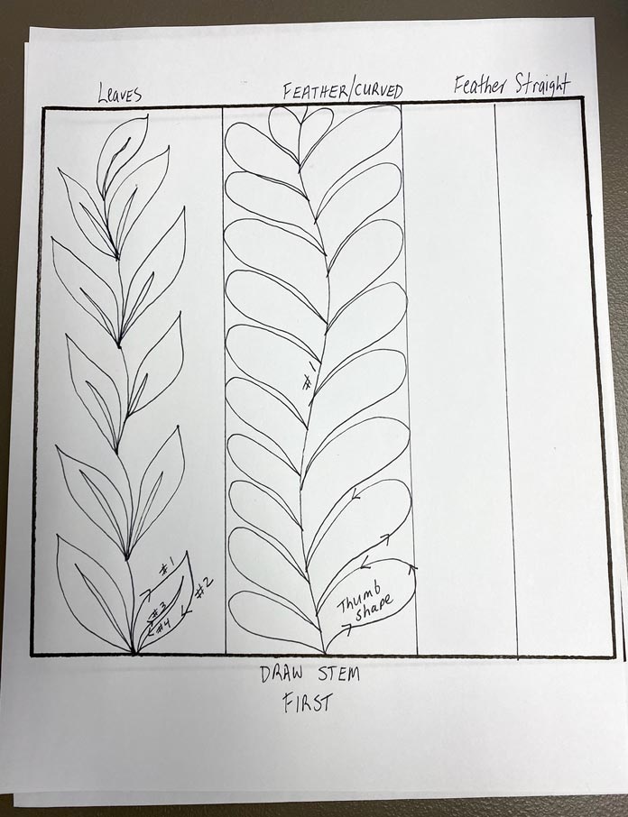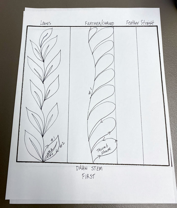 Boost your free motion quilting skills with these 3 nature-inspired designs by Robin Bogaert December 9, 2021 written by Robin Bogaert December 9, 2021 613 This week, I started out with simple fill stitches and tips for success with Free Motion Quilting (FMQ). Yesterday, we looked at 3 different spiral designs. Today, I want to discuss organic looking leaves, feathers, and plumes to add some very beautiful texture to quilts. I continue to work with Gütermann Sew-All Threads, Metallic Threads and Cotton Threads as well as Fabric Creations – Grey Textured fabric, and of course the very versatile UNIQUE Sewing Wash-out Marker. I can’t emphasize enough how important it is to draw the designs ahead of time and practice the brain to get ready for FMQ. Below are the drawings I’ll be discussing today: FMQ continuous leaves, leaf borders, feathers and combining feathers, swirls, leaves and plumes. Pre-drawing leaves, leaf borders, feathers, combining leaves, feathers, plumes and swirl designs to get ready for FMQ Design 1 Continuous leaves The continuous leaf design is drawn out as shown below. How to draw the continuous leaf design before quilting it Full continuous leaf design; follow the numbers to see how the leaves are drawn out Continuous leaf practice sample with Gütermann Cotton Thread in green, an organic design that looks great in green thread! Design 2 Borders The leaf borders and feathers are drawn out as shown below. Leaf border designs and feather designs How to draw the leaf border design As you can see, the stem is drawn continuously as you move to the next leaf. Follow the numbers to design the leaf. Continuing to draw the leaf border design With the feather borders, draw the vein through the middle, first starting at the top moving downwards. When you reach the bottom, draw the first thumb almost like half a heart, and then move your way up the center vein. Drawing a feather border design The right side is complete Draw the other side of the feather continuously from the top down as shown. Feather design completed The straight feather is done in the exact same manner except using a straight center vein, and I tried to omit the gaps between the feathers (a personal choice). Finished leaf and feather FMQ design with black Gütermann thread Design 3 Combining leaves, feathers, plumes and swirls Swirls are really just an elongated leaf without veins. Below is the drawing practice. Drawing practice for leaf, feathers and plumes This design is pretty self-explanatory if you’ve practiced the feathers. As shown, the plumes are elongated leaves in shape, and then swirls are added in between randomly. How to draw feathers and spirals Finishing the design Feathers, leaves, plumes combined with swirls and stitched with black Gütermann thread Completed designs as potholders Join me tomorrow for a discussion about some exciting Sew Easy Monster and Circle templates. I’ll discuss how templates and Sew Easy Freezer Paper can help with quilt marking and the design process. I’ll also share my process for making these quilt practice samples into easy, practical potholders, ready for gift giving. This is part 4 of 5 in this series Go back to part 3: How to free motion spirals on your quilt: 3 dynamic designs Go to part 5: 2 great template sets you need for impressive free motion quilting Print this page or save as a PDF 0qs393Fabric CreationsFabric Palettefabricsfree motion quilting tutorialfree patternsGütermann Sew-All ThreadnotionsOdif 505 Temporary Quilt Basting Adhesive Fabric SpraypotholdersSCHMETZ Quilting Needlessew easySew Easy 9 Piece Circle TemplateSew Easy Freezer PaperSew Easy Jelly Monster TemplatetutorialsuniqueUNIQUE Quilting Therm FleeceUNIQUE Sewing Wash-Out Marker FacebookTwitterPinterestLinkedinRedditWhatsappTelegramEmail Robin Bogaert Robin Bogaert is a long arm quilter, creator and blogger at quiltingintheloft.com and has many years of quilting experience. Robin was the past owner of a quilt shop in Windsor, Ontario and now resides in Waterloo. Robin's roots in quilting are traditional, however she appreciates modern quilt design as well and considers the focus of work to be designing, teaching, trunk shows, free motion quilting, ruler work and thread painting. In addition to her passion for sharing all things quilting, Robin is busy with pattern design and sells her patterns on her website and with Craftsy.com. Robin was featured in the Summer 2016 and 2017 (Canada 150th) edition of Quilters’ Connection Magazine and is a new guest contributor at QUILTsocial.com. previous post How to free motion spirals on your quilt: 3 dynamic designs next post 2 great template sets you need for impressive free motion quilting YOU MAY ALSO LIKE... Your Go-To Guide to SCHMETZ Needles: Types, Pairings... Creative quilting with SCHMETZ Twin Needles and Clover... Essential SCHMETZ needles for specialty sewing and smooth... Sewing with SCHMETZ Twin Needles: understanding size &... Best SCHMETZ needle sizes for 30wt & 12wt... Choosing the right SCHMETZ needle size for cotton... Round-Up: A 5-Day Journey Making the Burda 5941... Finishing Burda 5941 Jacket: seam details, binding &... Sewing Burda Jacket 5941: seam finishing tips for... Leave a Comment Cancel Reply Save my name, email, and website in this browser for the next time I comment. Δ This site uses Akismet to reduce spam. Learn how your comment data is processed.