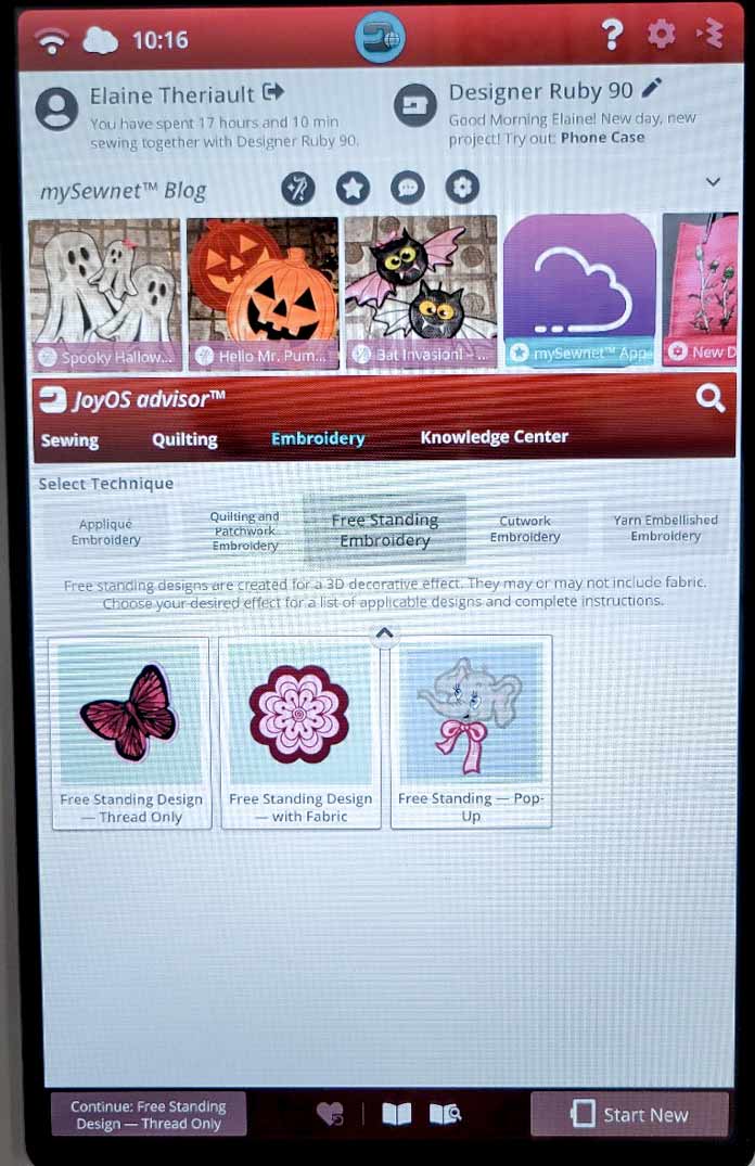 On the Welcome Screen, under JoyOS advisor, select Embroidery.