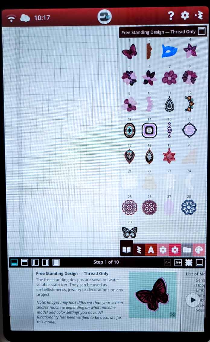 A list of different embroidery techniques appears on the screen. I choose Free Standing Embroidery, and within the free-standing embroidery section, I find three techniques. WOW – that’s super impressive to see all that information built into the Designer Ruby 90, and I have it on my smartphone as well.