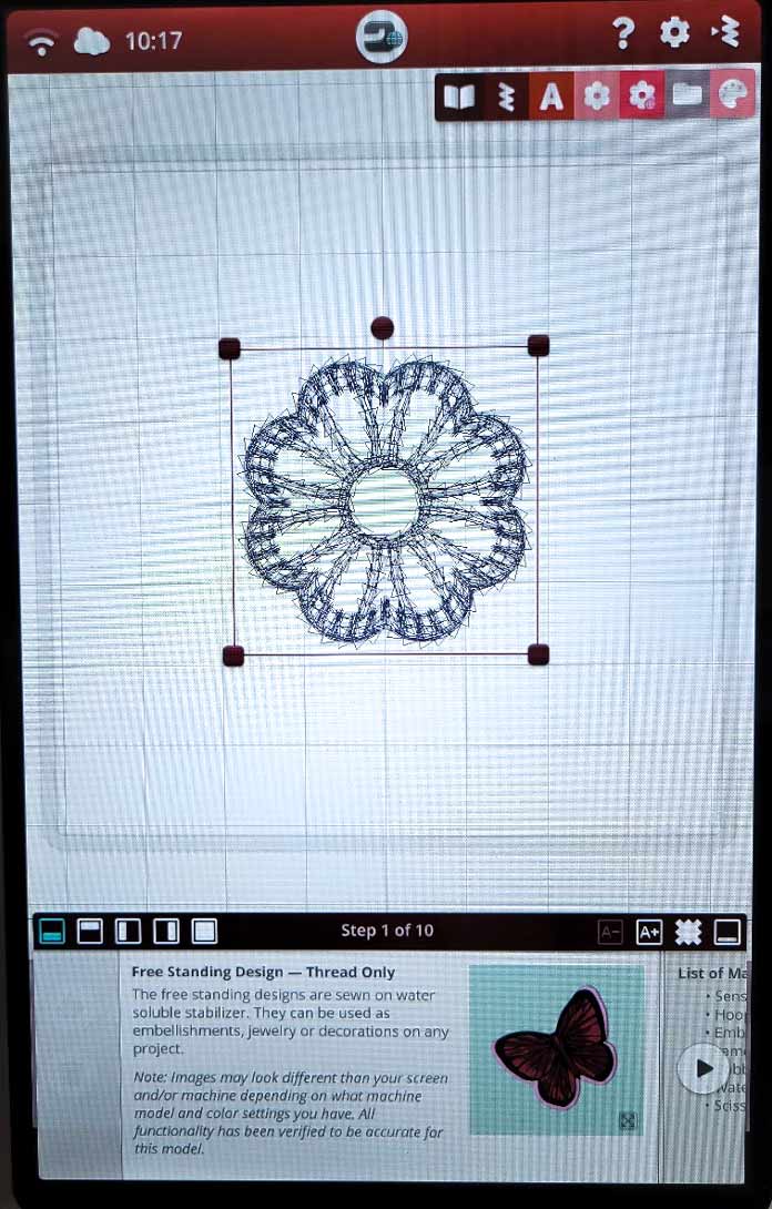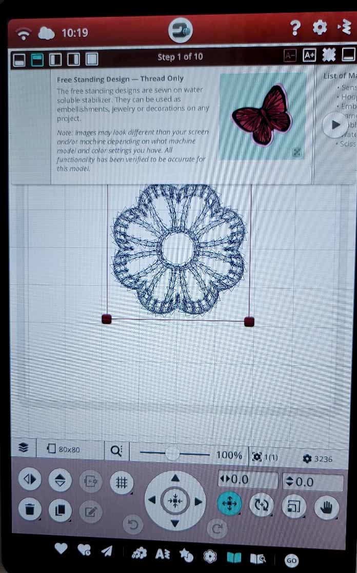 I moved the tutorial to the top of the screen to access the edit tools along the bottom. The Designer Ruby 90 selected the smallest available hoop size for the motif – the Small Square Hoop (80mm x 80mm). The stitch count is 3,246, so the design is pretty small. Did you know that you can enter all the hoop sizes you own into the Designer Ruby 90? That way, the embroidery machine chooses the most appropriate hoop size based on what you own. This feature is in the Default Embroidery Settings in the Settings menu.