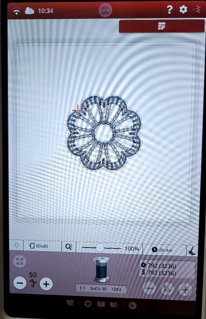 Now it’s time to move to Embroidery Stitch Out. You can see on the screen that the time to complete the motif is 4 minutes. Perfect for experimenting.