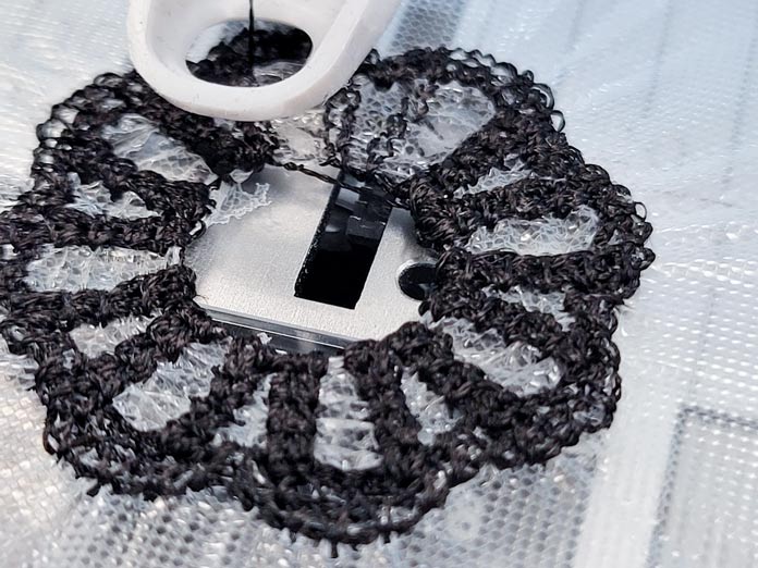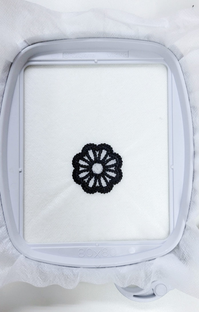 Oh – the stabilizer in the center of the motif has completely disappeared with the stitching. Remember, there are only 3,256 stitches in this design, so there are not many, but enough to cut through the water-soluble stabilizer.