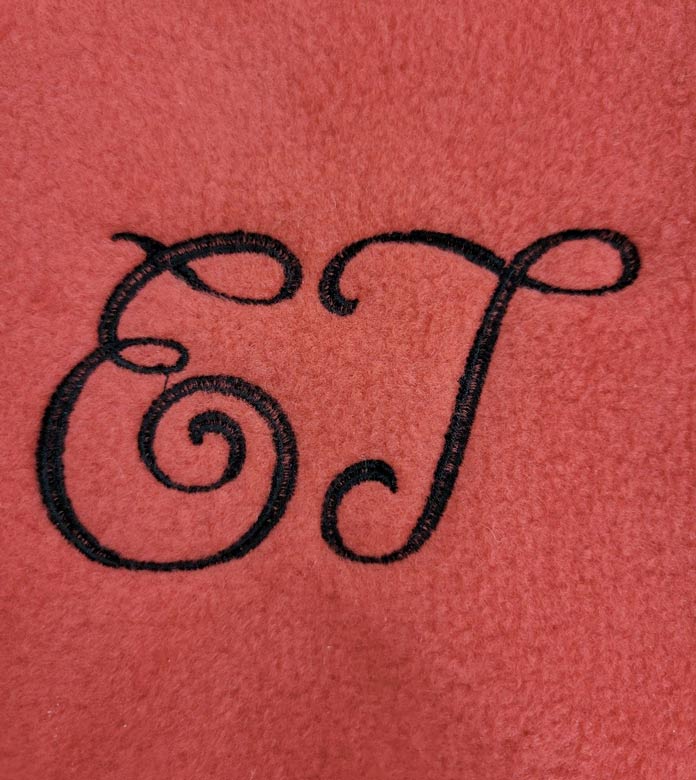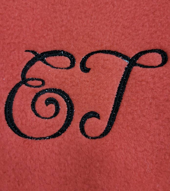 Here’s the finished design. Although it’s passable, I can see the red fleece popping through the center of the letters. Hmmm – I think I can do better than that.