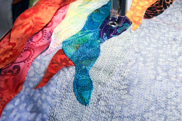 Must-have tools to guide you through free motion quilting by Claire Haillot November 12, 2021 written by Claire Haillot November 12, 2021 577 Welcome back to my last post of the week on how to create this stunning Ariel art quilt pattern designed by Lise Bélanger. Yesterday was about 6 essential tools to help place interfacing onto your fabrics. Today, I am so happy to share my tips on how to free motion quilt this project. I must say that creating this quilt had its share of challenges, but I was able to succeed thanks to several tools I found. These tools are must-haves when it comes to free motion quilting. Presenting the must-have tools for free motion quilting the Ariel art quilt pattern by Lise Bélanger Here are the must-have tools I loved using for quilting this project. Klassé Quilting Needles Size 80/12 These needles are ideal for quilting this project using Gütermann 30 wt cotton quilting thread. Their strengthened longer shaft helps reduce needle deflections as the needle penetrates multiple layers of fabric while maintaining a perfectly straight stitch. Now keep in mind that I used Fairfield Toasty Cotton Natural Cotton Quilt Batting for the project. And I can honestly say that I used all the 5 needles in the cassette to quilt this project. As soon as you start ‘hearing’ the needle punching through the fabrics, it’s time to change needles (tops 8 hours on this piece as there was a lot of layers and interfacing). UNIQUE Quilting Grip Gloves I honestly can’t quilt without them! Wearing these gloves help you easily control your project as you quilt! They have soft, flexible grips that give you full hand control so you can guide fabric effortlessly reducing tiredness and tension in hands, arms, shoulders and neck. UNIQUE Sewing SeamFix Red Seam Ripper and Thread Remover Now this is a new tool for me and I can honestly say that it will never leave my side. Now it starts as a seam ripper with sharp blades, so there’s nothing amazing about that part. But it’s for what follows that makes this tool so great! It has a safety ball and lid with innovative thread removers on each end. Especially formulated plastic material grabs and removes excess threads without marking or sticking to the fabric. And yes! I had to make a video to show you exactly how useful it is when you need to undo a section you just quilted. I really enjoyed quilting Ariel using the free motion quilting. I started by quilting the eye as those were the smallest fabric pieces and I didn’t want them to accidentally peel off while quilting the rest of the project. And then I moved around the eye. Changing the thread color every time I changed sections to match the fabric. Quilting straight lines to reproduce the horse’s body The trick to a smooth free motion quilting is to adjust the speed of your machine and knowing what you want to quilt before starting. Here’s a video showing how I quilted the straight lines using the free motion technique. And here is a video demonstrating how I free motion quilted one of the manes. I also demonstrate how the bent tweezers are so useful to grab the threads at the beginning of the quilting to ensure proper tension. And listen to the end as I show how to cut off and hide the thread at the end of the quilting. Free motion quilting on the Ariel art quilt pattern by Lise Bélanger Now I know what you’re thinking! You’re afraid to make this quilt cause you don’t think you can pull the quilting off…. Well, here’s the scoop… YES, YOU CAN! This project makes it really simple… because the mane is a collection of small pieces, they’re actually the perfect size to practice. And best of all you can practice with a pen and paper beforehand. Here’s another video to explain my process! Once you finally finish quilting, you’ll have one last thing to do, after you finish the binding of course! The final tool you need for this project is the Odif Fabric Protect. You simply spray an even application throughout your project to protect it from dust or unexpected spills while also protecting it against sun fading from the UV rays. And don’t worry, it won’t stiffen, soak or discolor your fabrics. It’s the final touch for any art quilt. Odif Fabric Protect is the must-have product for any art quilt And that ends my week of blog posting on how to create this stunning art quilt. I really hope that I’ve convinced you to make one for yourself. It’s not too late to get started; it can be the perfect Christmas gift for a loved one. And remember that free motion quilting can be a success with the help of tools like Klasse Quilting Needles Size 80/12, UNIQUE Quilting Grip Gloves, and UNIQUE Sewing SeamFix Red Seam Ripper and Thread Remover. Please do share and comment below as I love to hear your thoughts on my posts. This is part 5 of 5 in this series Go back to part 4: 6 essential tools for detailed art quilt appliques Print this page or save as a PDF 0qs389Ariel Art Quilt Patternart quiltart quilt tutorialcloverClover Water Soluble MarkerGÜTERMANN threadsheatnbondHeatnBond Feather Lite Iron-On AdhesiveKAIKAI 1000 Series Embroidery ScissorsLise BelangernotionsolisoOliso M2Pro Mini Project IronOmnigripOmnigrip RulerQuilting Grip GlovesQuilting Needlessew easySEW EASY Colour & Tone Guide and Tonal EstimatorSewing SeamFix Red Seam Ripper and Thread RemoverthreadsuniqueUNIQUE Lighting Foldable LED Desk LampUNIQUE Quilting Wool Pressing MatUNIQUE Sewing Twizzers FacebookTwitterPinterestLinkedinRedditWhatsappTelegramEmail Claire Haillot Claire Haillot shares her passion for quilting among her neighbors in the United States and Canada as well as her cousins in France. Claire has been active in the quilting industry since 2004. At first, she opened a quilt shop and started to teach, write how-to guides, and translate patterns and product information into French for American companies. In 2006, she started her own line of patterns and later began publishing patterns and 