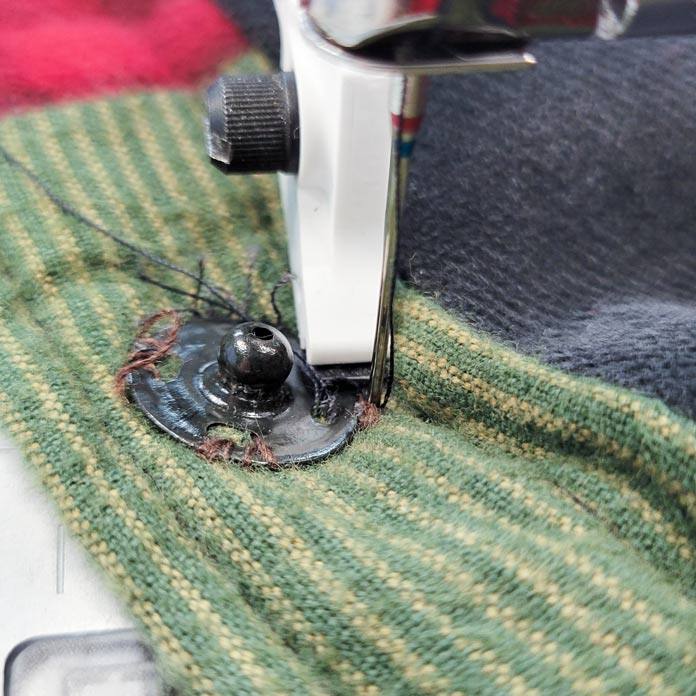 Sewing on a button and a snap with the Husqvarna Viking Designer Ruby 90 by Elaine Theriault November 26, 2021 written by Elaine Theriault November 26, 2021 616 Wow! The week has flown by, and it’s already Friday! I’ve had so much fun; playing with the different Inspira stabilizers, trying out different fabric types for machine embroidery, and mending that sweater yesterday was brilliant. All of it was super easy using the Husqvarna Viking Designer Ruby 90. Husqvarna Viking Designer Ruby 90 I’ll admit that I’m a bit of a lazy sewist. I love handwork, but if I can do the task with a sewing machine, I’ll do it. I have a jacket to repair today, and I was going to do it by hand, but that meant finding some hand needles, and well, the Designer Ruby 90 was calling to me. So, I’m repairing the jacket with the sewing machine. Now the repair is straightforward. A snap used to close the jacket, which I had initially stitched in place by hand, was coming loose, and I figured it was better to fix the snap now before it completely fell off and got lost. You know what they say – a stitch in time saves nine! It’s so easy to sew buttons on with the sewing machine, but did you know there are several ways to do that? Let’s have a look. I’ll start with the optional Button Foot with Placement Tool. It easily snaps onto the presser foot ankle. The Button Foot with Placement Tool What’s nice about the Button Foot is that if I need the button sewn on without a shank, it stays in the position shown above. If my fabric is thick, then I need the button sewn on with a shank. It’s easy to transition between the two settings as there’s a small gray lever on the right-hand side, and by pulling that forward, a plastic ridge appears at the front, and the shank (made of thread) forms over that ridge. The Button Foot set to sew a button with a thread shank Along the front of the Button Foot, you’ll notice that there’s a slot on either side of the foot. These slots hold the button in place. It can be tricky to get the button into the slots and get the holes lined up with the needle. However, there’s a handy tool that makes this job super simple. The Placement Tool has two prongs that you insert into the holes of the button. Use the prongs of the Placement Tool to grab the button. Then it’s simple to insert the button into the front slots. The way the Placement Tools grabs the button ensures the button’s holes are in line with the needle. Using the Placement Tool to insert the button into the Button Foot Then you can remove the tool, and you are ready to sew. But wait – the needle isn’t in the correct position in this photo because I did not select the stitch that I’ll use to sew on the button. The button sits in the Button Foot, ready to be stitched in place. It’s so easy; it’s child play! When I turn the Designer Ruby 90 on, the JoyOS Advisor appears on the opening screen. And let’s look in the bottom right-hand corner. What does that say? Sew on button! Wow – how easy is that? The JoyOS Advisor Selecting that icon opens a window with the correct stitch for sewing on the button. A tutorial to explain what supplies are needed and how to sew the stitch also appears. And even better, the Designer Ruby 90 is now ready to sew the button on. All the settings are taken care of by the JoyOS Advisor. I love it! The machine settings and a tutorial for sewing on a button appear on the screen. Now you’ll notice in the tutorial, that the Multipurpose tool is used to hold the button in place. If you need a thin or thick shank, the Multipurpose tool can be used instead of the Button Foot. The Multipurpose foot is part of the accessories for the Designer Ruby 90. Either option will work. The Multipurpose tool The default width of the stitch for sewing on the button is 3mm. That is pretty much an industry standard, but I still manually test the left and right needle position by manually turning the handwheel. The last thing I want is bits of broken buttons or needles flying around the studio. Manually checking the needle position for sewing the button on The other thing to note on the tack stitch used to sew on the button is the number of times the needle goes left to right. You’ll see in the settings that the default is 8. That’s probably a couple more than I would do if I were sewing the button by hand. You can increase or decrease that number. The default width and length of the standard stitch used to sew buttons Now that everything is ready, let’s see it in action. Isn’t that just the best? But I want to re-attach a snap, so I’ll use a slightly different technique to fix the jacket. I’ve removed the Button Foot, and I’m not going to use the Multipurpose Tool. I’m simply going to use the presser foot ankle to hold the snap in place. Only two sides of the snap were loose, so I didn’t need to secure it to the jacket. But if I had to, I could use some tape, which they recommended in the built-in tutorial. I carefully positioned the snap so the hole would line up with the needle. I manually tested that the needle would go back and forth and not hit the snap. Use the presser foot ankle to hold the snap in place while it’s tacked in place. That was too easy. Make sure you clean up the old threads first. And here is the snap, firmly attached on all sides. I really should’ve removed the rest of the hand stitching and secured all four sides of the snap with the Designer Ruby 90. Since each securing stitch took seconds, I might go back and do that. The snap is now securely back in place. WOW – WOW – WOW – that was so easy! I’m having so much fun creating new things and repairing things with the Husqvarna Viking Designer Ruby 90. It’s an excellent machine that does all kinds of jobs! My week is up, but you can bet that I’m scouring that pile of projects to see what else I can fix or create with this fabulous sewing and embroidery machine. Be sure to stop by yo