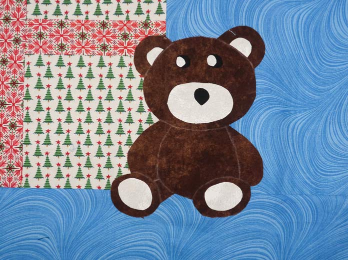 There are many Christmas-themed elements you can use to embellish this quilt top, such as a nutcracker, doll, bear, or maybe even a spinning top. I decided to add a teddy bear to the quilt top.