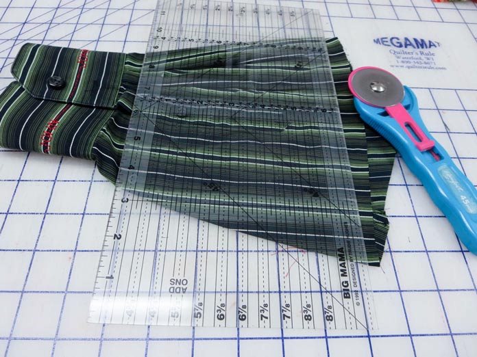 Transforming a shirt sleeve into a gift bag – A great way to upcycle! by Jean Boyd October 22, 2021 written by Jean Boyd October 22, 2021 591 Yesterday, I showed you how to use the cuff from a shirt or blouse to make a gift card holder and embellish it with decorative stitching using the Brother Innov-is NQ700 machine. Gift card holder made from a shirt cuff Today, I’ll show you how to make a gift bag using a shirt sleeve. We’ll also use some decorative stitches and character stitches to personalize the gift bag. Here’s a picture of the operation panel at the front of the machine showing the keys that we’ll be using. Keys on the operation panel for today’s project Let’s get started! Cut the shirt sleeve 6″ to 8″ above the cuff. Cut the shirt sleeve 6″ to 8″ above the cuff. Press the Character key (the one with the big letter A). This brings up 5 different character sets (Gothic, Handwriting, Outline, Cyrillic and Japanese) so you can choose the one that’s most appropriate for you. All the character stitches are well illustrated in the Quick Reference Guide book that comes with the Brother NQ700. You can also see the letters on the top cover of the machine. Character letters and symbols on the top cover of the machine Each letter is numbered. Press the number of the letter you want on the keypad and the letter appears on the LCD screen. You can save the name by pressing the memory key button (it looks like a pocket with an arrow going into it). To retrieve the saved stitches, press the saved pattern key (it looks like a pocket with an arrow coming out of it). As you can see, I’ve saved the name John so it can be stitched on the gift bag. I also added some straight stitches to the design before saving it. The name John shown on the LED screen Using one of the design lines on the cuff fabric, stitch your chosen name. As you get close to the end of your stitching line, itʼs nice to be able to use the single/repeat key. This means that the machine stops sewing when it comes to the end of the name. What a great feature this is on the Brother NQ700 machine! The name John stitched along the length of the cuff You can also add some extra lines of decorative stitching to further enhance the cuff. I used the SA186 open toe foot so I could see exactly where to stitch. Finishing the gift bag Use a rotary cutter and ruler to trim the cut edge. Trim the cut edge of the fabric. With right sides together and having the buttoned opening in the center, sew along the bottom edge using the quarter inch foot with guide. Sew along the bottom opening Turn right side out and you have a wonderful, personalized gift bag! These bags can be made larger or smaller just by cutting the sleeve at a different length. My shirt sleeve was missing one button, so I decided to remove all the buttons and sew on some bright red ones to make this even more Christmassy. Finished gift bags made from upcycled shirt sleeves I’ve been using the Brother NQ700 machine for just a few weeks, but I’m very impressed with the stitch quality, the number of built-in features it has and how easy it is to operate. This would be the perfect machine for a beginning quilter or to take to classes or retreats. I hope you enjoyed learning about this machine and making a few projects for the upcoming holiday season! This is part 5 of 5 in this series Go back to part 4: Upcycling a shirt to make a gift card holder – smart and reusable! Print this page or save as a PDF 0qs386BQ3050brotherChristmas projectsfree patternsgift baggift card holdernotionsNQ700quilting tutorialsquiltssewing machine reviewstechniquesupcycling projectswall hangings FacebookTwitterPinterestLinkedinRedditWhatsappTelegramEmail Jean Boyd Jean has been designing and publishing patterns since 1997. For the past several years she has been designing patterns for new fabric collections by Northcott Fabrics. Her work has been published in several magazines in both Canada and the United States. Jean holds a Fiber Arts Certificate in quilting and has taught extensively throughout Canada, including six national Quilt Canada conferences. She was named "Canadian Teacher of the Year" in 2003 by the Canadian Quilters Association and has won numerous awards for her quilts. previous post Upcycling a shirt to make a gift card holder – smart and reusable! next post Exploring the Multi-Touch Screen on the PFAFF performance icon YOU MAY ALSO LIKE... What to do with leftover fabric: It’s all... In quilting, using a twin needle IS double... Making the most of decorative stitches for making... The very best way to prepare your template... The Brother NQ700 and decorative stitches: the perfect... Upcycling a shirt to make a gift card... Planning ahead for successful decorative stitching using the... Sewing the front of the Pop-Out Picture quilt... Frame it with a Pop-Out Picture quilt: the... Leave a Comment Cancel Reply Save my name, email, and website in this browser for the next time I comment. Δ This site uses Akismet to reduce spam. Learn how your comment data is processed.